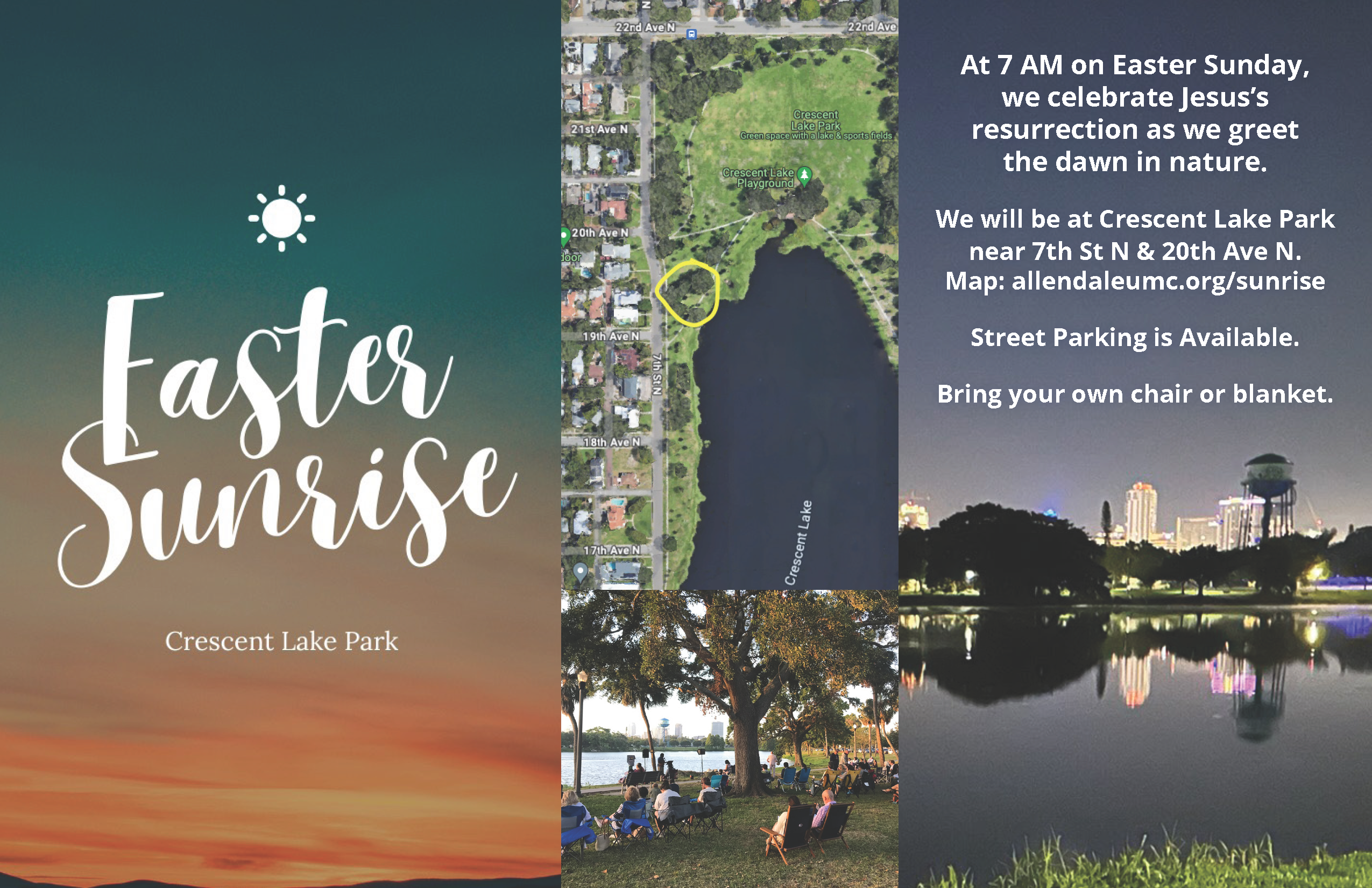 Join us early on Easter morning for a Sunrise Service starting at 7 AM at Crescent Lake Park, where several United Methodist congregations from across the area will gather together to celebrate the resurrection of Jesus as the day begins. There is something powerful about greeting Easter at dawn—being outdoors as the light slowly fills the sky and remembering the story of that first Easter morning when the women came to the tomb at daybreak and discovered new life.