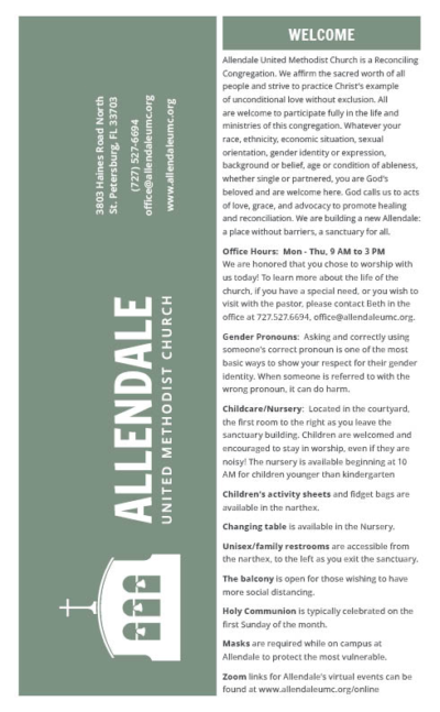 Download a PDF version of our weekly bulletin containing an order of worship for our Sunday service, upcoming events, and updates on our church family including birthdays and prayer requests, and more. Recently published bulletins are listed below.