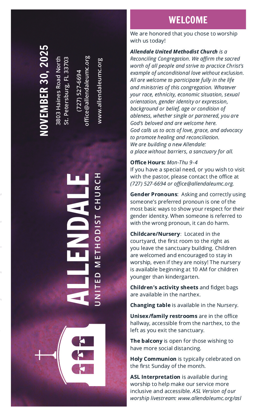 Download a PDF version of our weekly bulletin containing an order of worship for our Sunday service, upcoming events, and updates on our church family including birthdays and prayer requests, and more. Recently published bulletins are listed below.